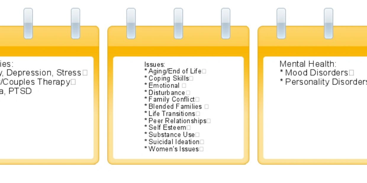 While I have extensive training, knowledge and experience in many facets of therapy, I specialize in anxiety/depression disorders, family/couples and trauma therapy, as well as mood and personality disorders. Most of my clients experience many different issues and we address them all. Specifics below.